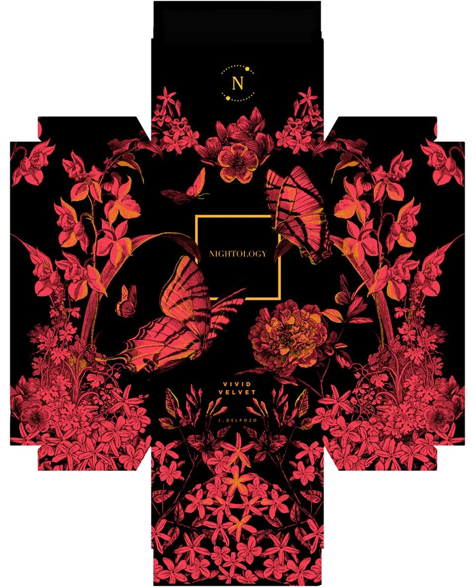 Once the individual designs were created for Vivid Velvet, Exquisite Lily, Suede breeze, Intimate Elixir, Wild temptation and Iris Shadow, all the packaging was printed in 3 inks, including gold foil.