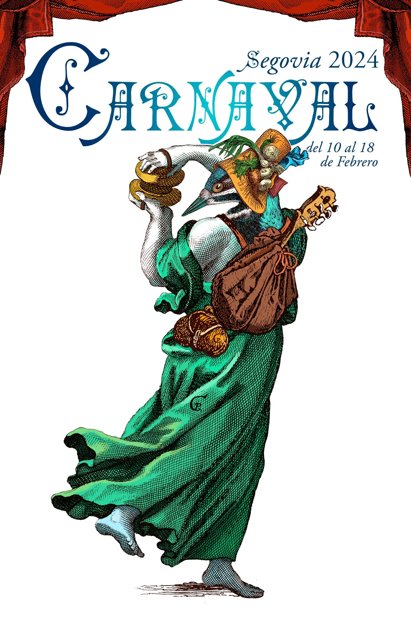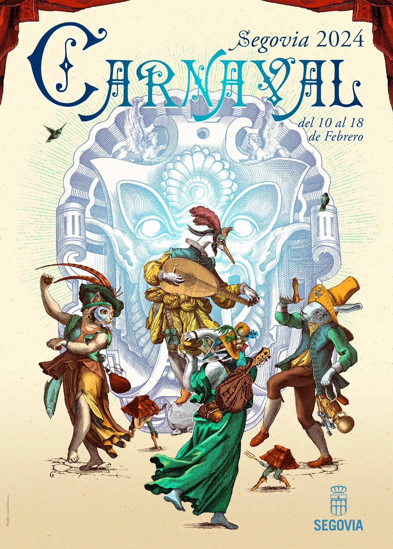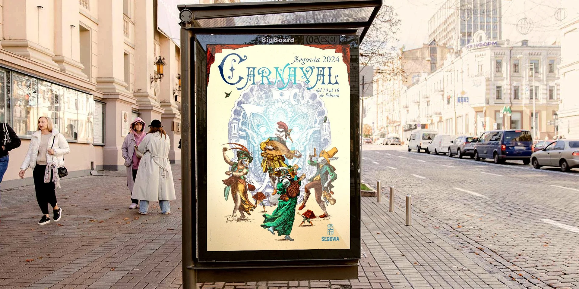 The City Council of the city of Segovia commissioned me to create the visual identity for its 2024 Carnival, which would be centered around the Baroque. The communication of this event through my illustration is carried out by bringing together typical constructive and sculptural elements, local legends and stories, as well as ethnological traditions of the region, to ensure the strongest possible connection between the city and the artwork.